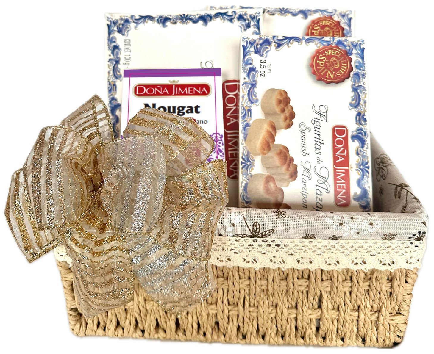 Un detalle encantador y sofisticado que reúne la tradición española en una presentación única. Incluye una variedad de turrones Doña Jimena, un lujo dulce que conquista paladares y aporta un toque especial a cualquier celebración.