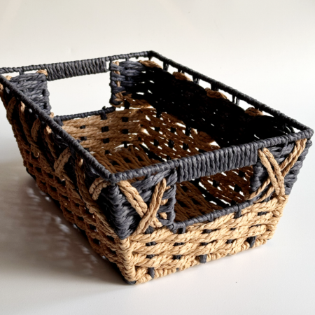 Charola con alma de metal tejida en cuerda bicolor.