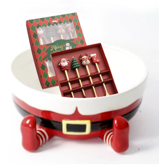 Estuche con 4 tenedores con adornos navideños y Charola de cerámica Santa